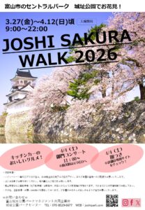 【3/27(金)~4/12(日)頃】JOSHI SAKURAWALK2026 2026.03.04更新 城址公園でお花見しませんか? 期間中はキッチンカーや屋台などのフード、 音楽等のイベントも予定されています! (詳細は随時お知らせ) 楽しい時間を、城址公園でお過ごしください🌸 ご来園の際は、下記ルールをお守りいただくよう ご協力よろしくお願いいたします ※写真はイメージです ※内容は変更になる場合があります。ご了承ください。